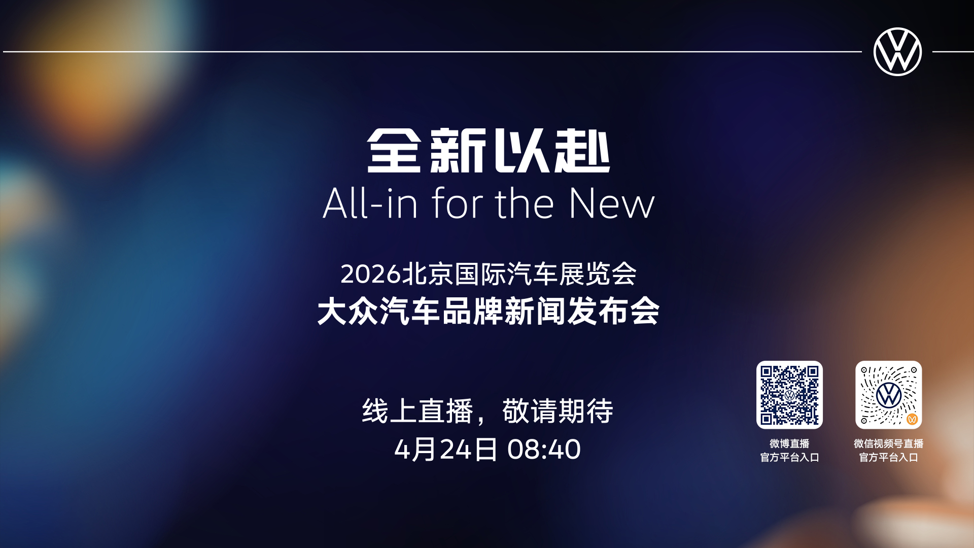 大众汽车品牌新闻发布会将于4月24日上午8:40正式开启直播。我们诚挚地邀请您扫描下方二维码,通过大众汽车品牌官方微信或官方微博账号在线观看。